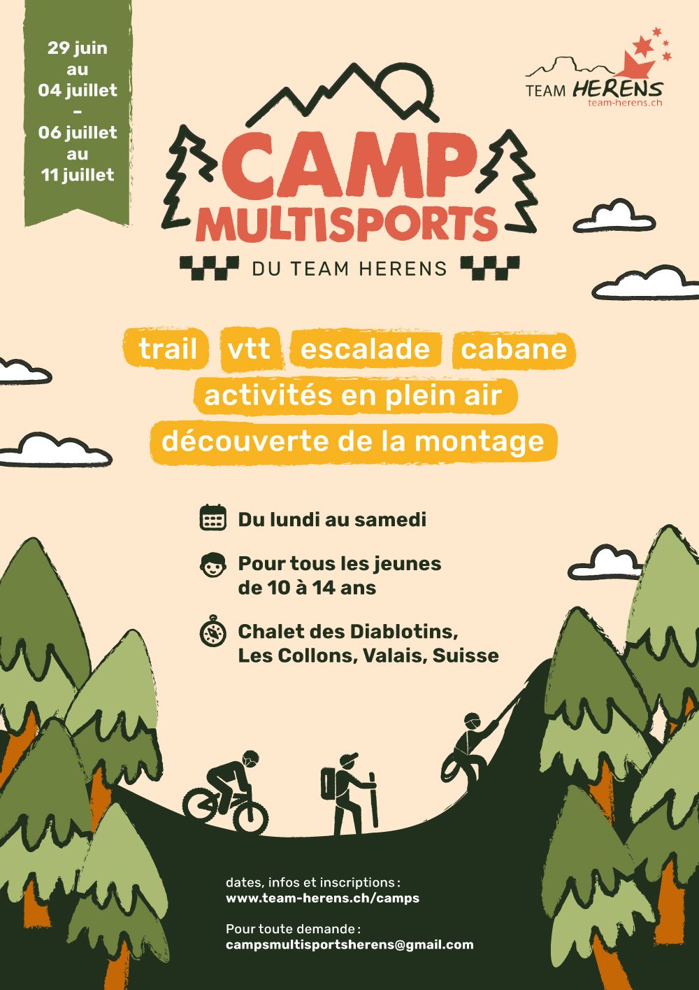 Eh oui ! Pour cet été 2026, grâce à l’impulsion d’une nouvelle équipe au sein du team hérens, des camps multisports sont organisés ! Ils se présentent sous la forme d’une semaine (du lundi au samedi, soit 6 jours et 5 nuits), et comprennent en plus des activités les repas et le logement. Découverte, aventure, partage et fun dans un cadre sécurisé et compétent, voilà ce que nous proposons ! La montagne ne demande qu’à être explorée, et la semaine sera axée autour des sports le permettant. Randonnée, VTT, escalade, trail, et bien d’autres activités récréatives et ludiques sont organisées chaque jour, rythmées par les moments de repas et de repos. Inscrivez-vous vite avant qu’il n’y ait plus de place disponibles, et on se réjouit d’avance de vous accueillir !